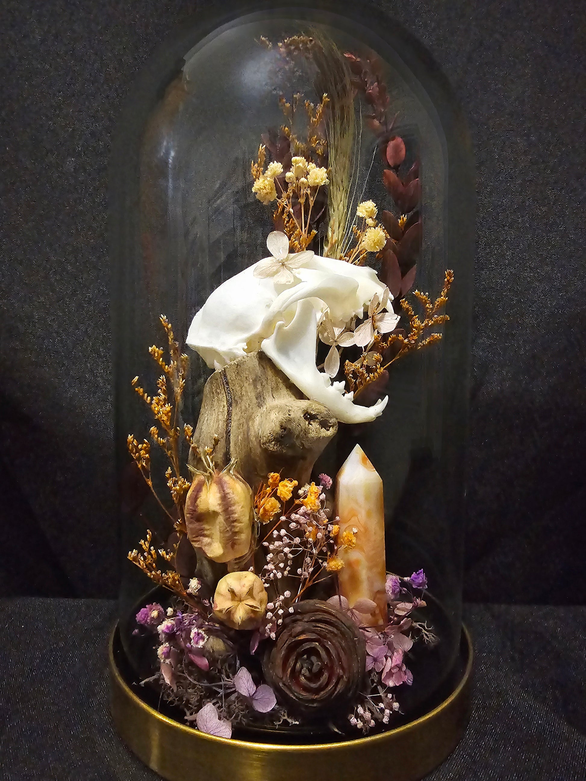 A glass dome terrarium housing a real cat skull, a mookaite generator and preserved flowers.