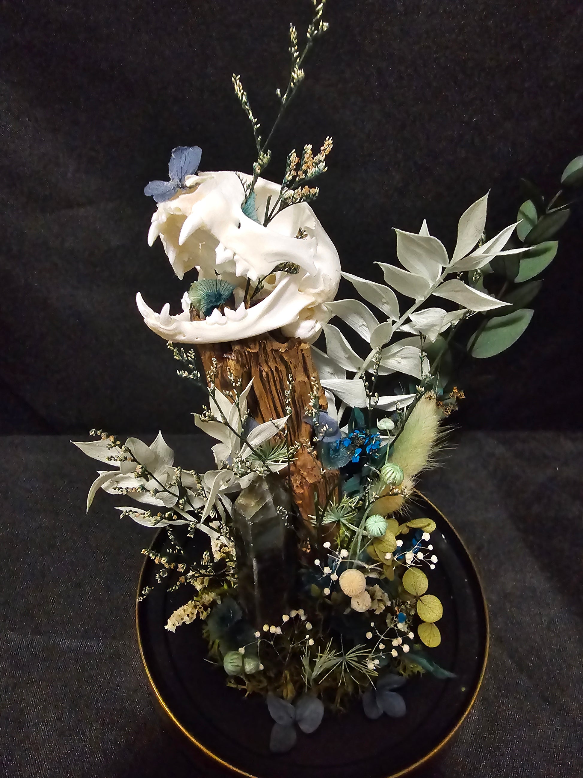 A glass dome terrarium housing a real cat skull, a labradorite generator and preserved flowers based on heat treated wood.