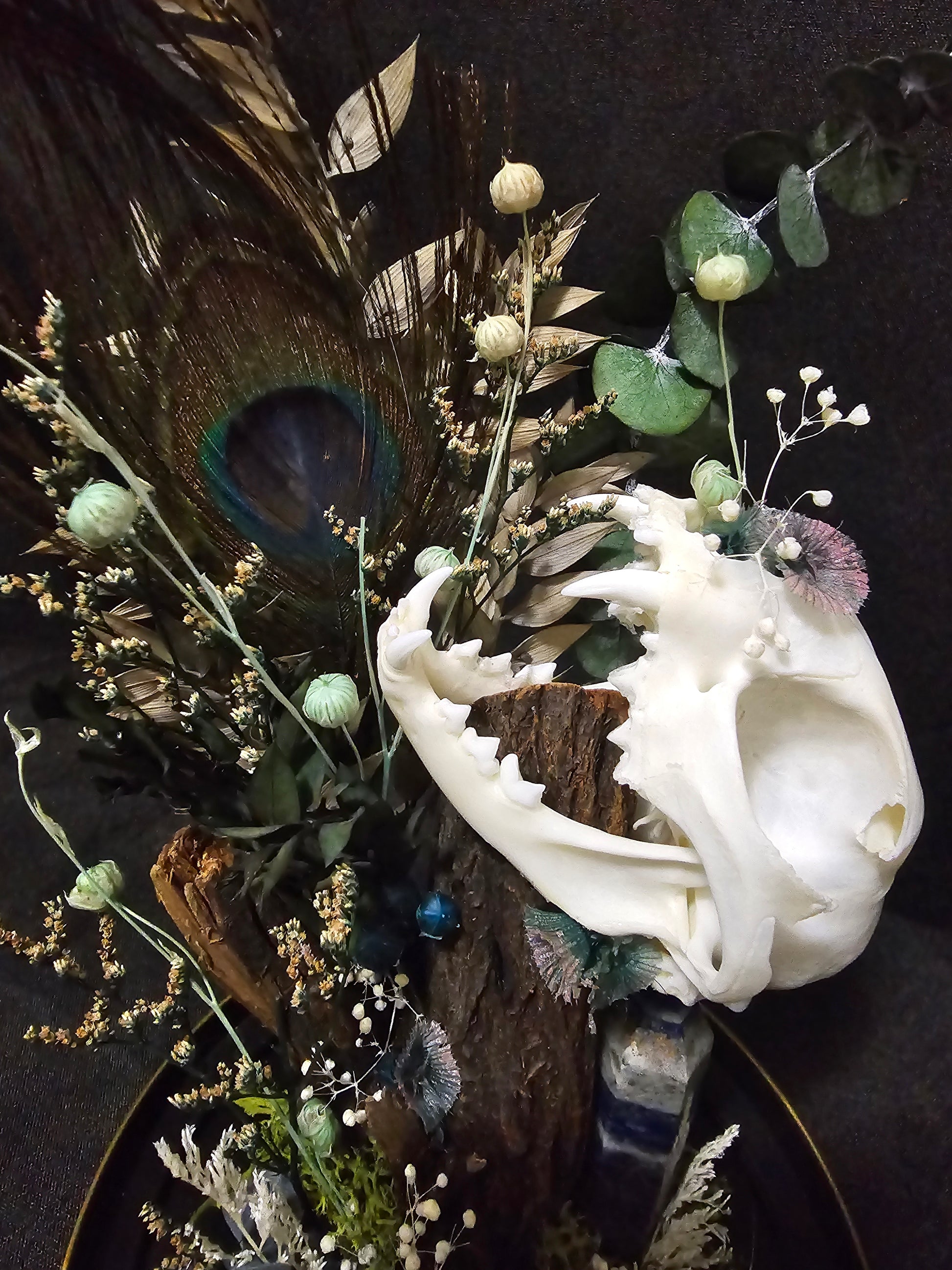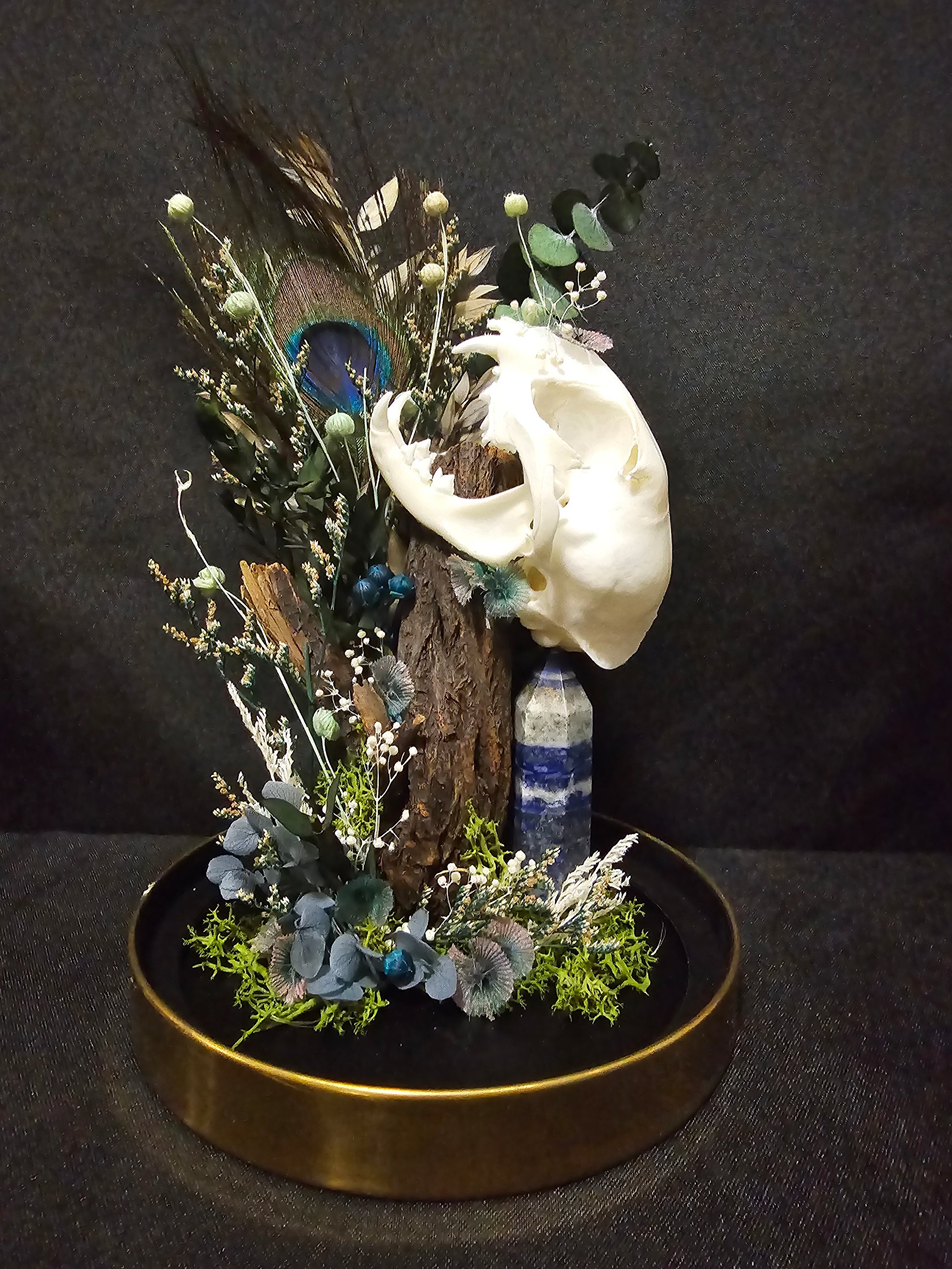 A glass dome terrarium housing a real cat skull, a sodalite generator and preserved flowers based on heat treated wood.