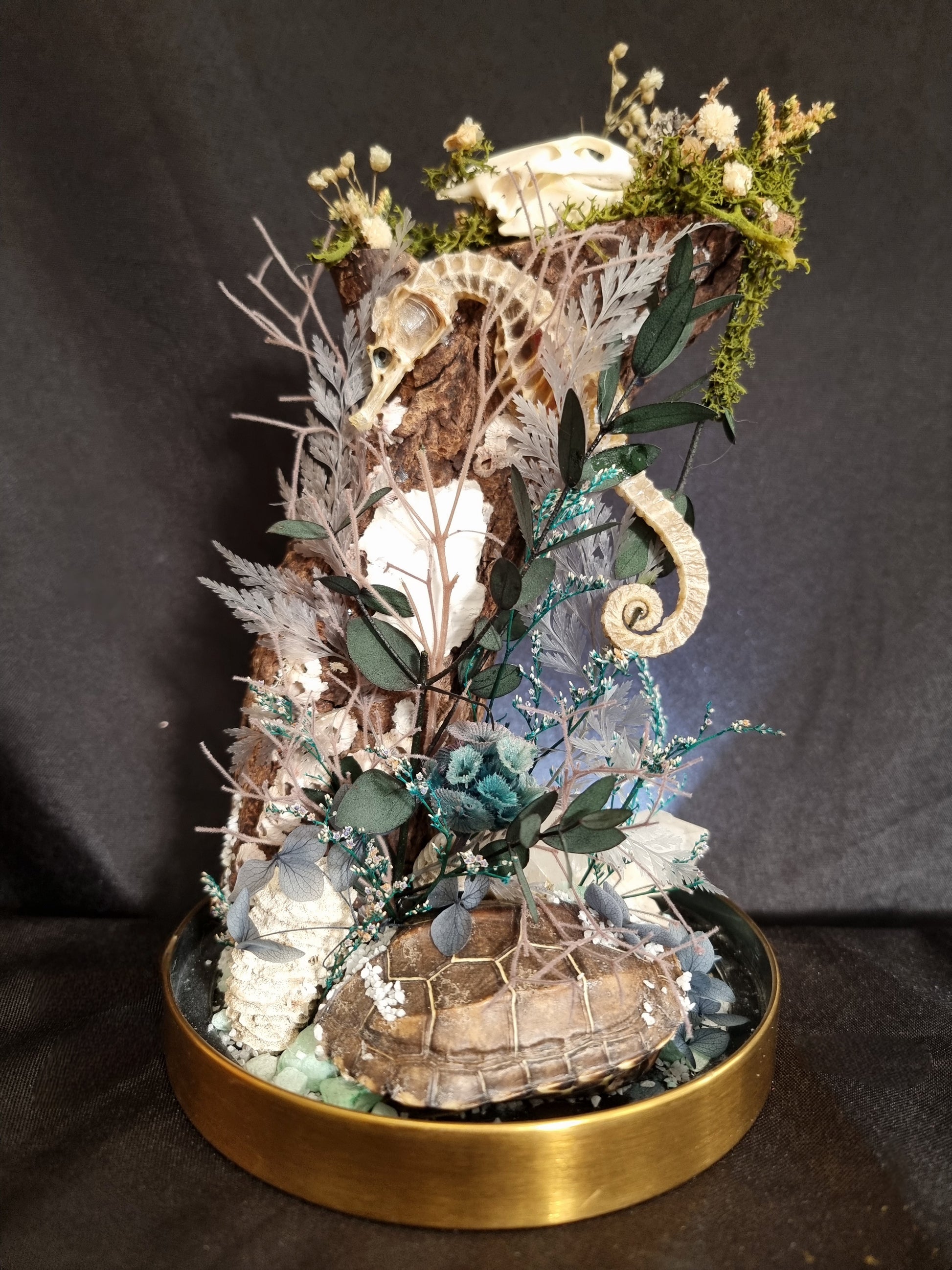 Dome terrarium housing a real dried seahorse skeleton, turtle skull and shell with heat treated wood with barnacles, quartz crystal and preserved flowers.