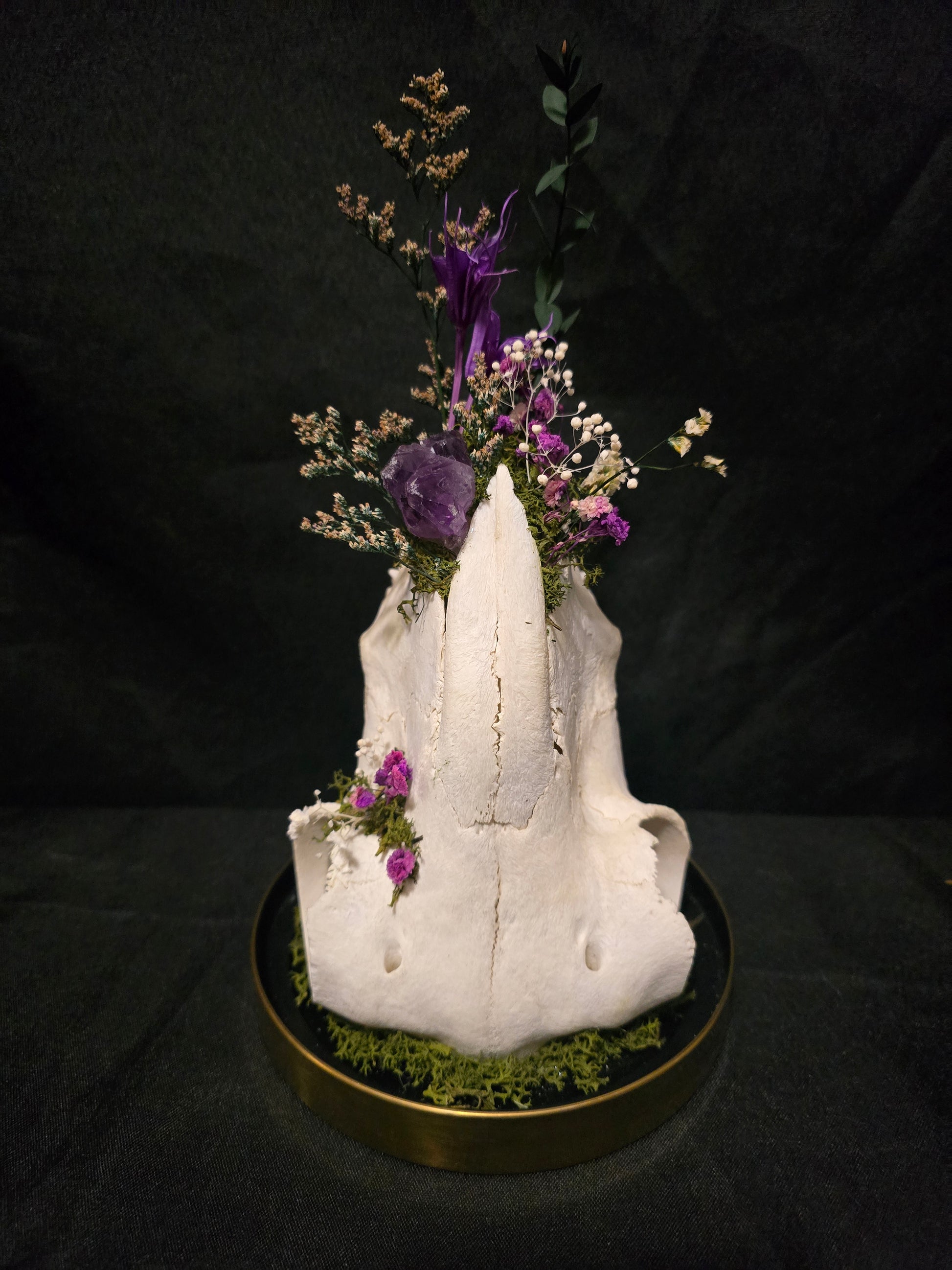 A glass dome terrarium housing a real sheep skull, an amethyst cluster and preserved flowers.