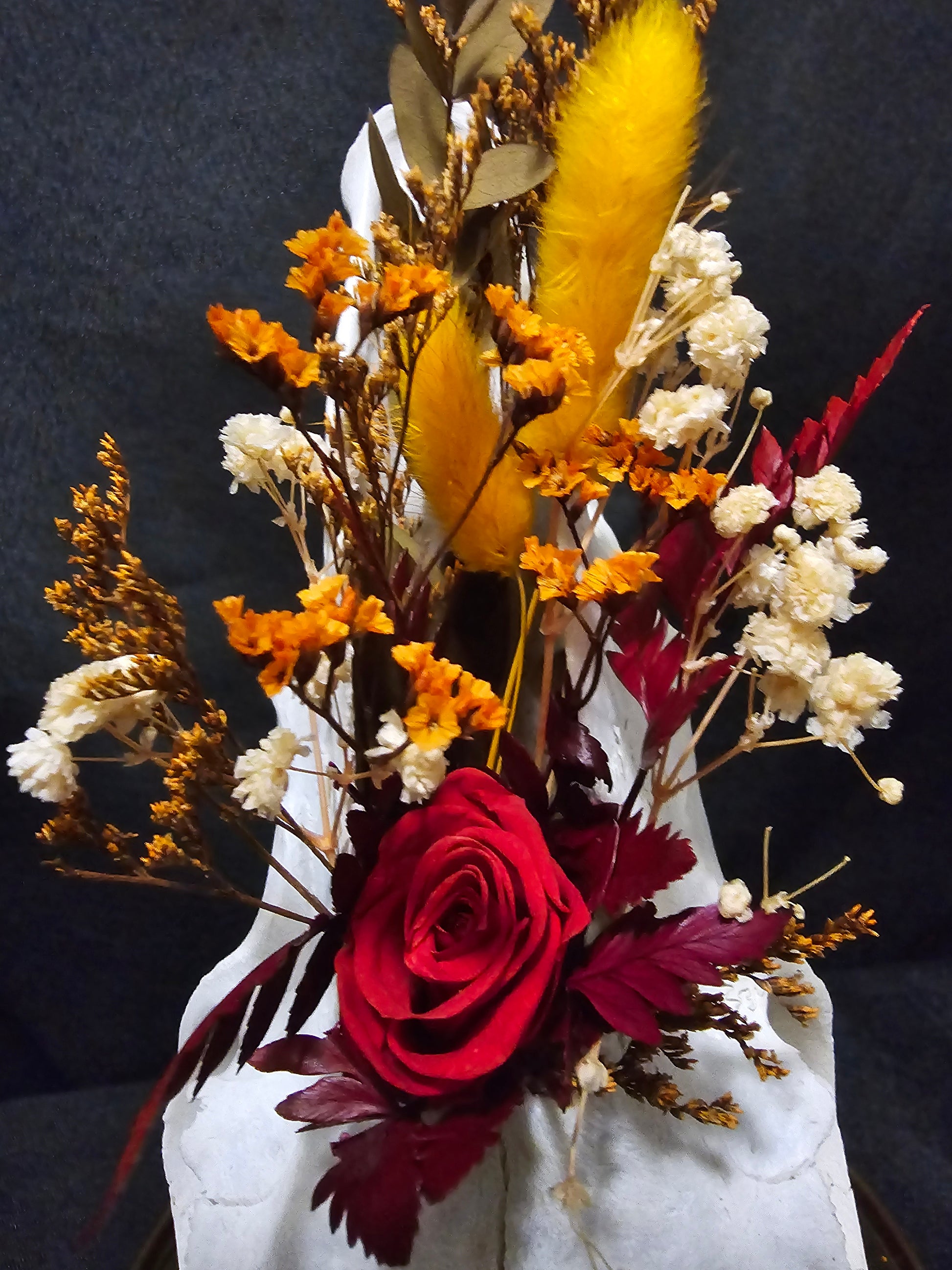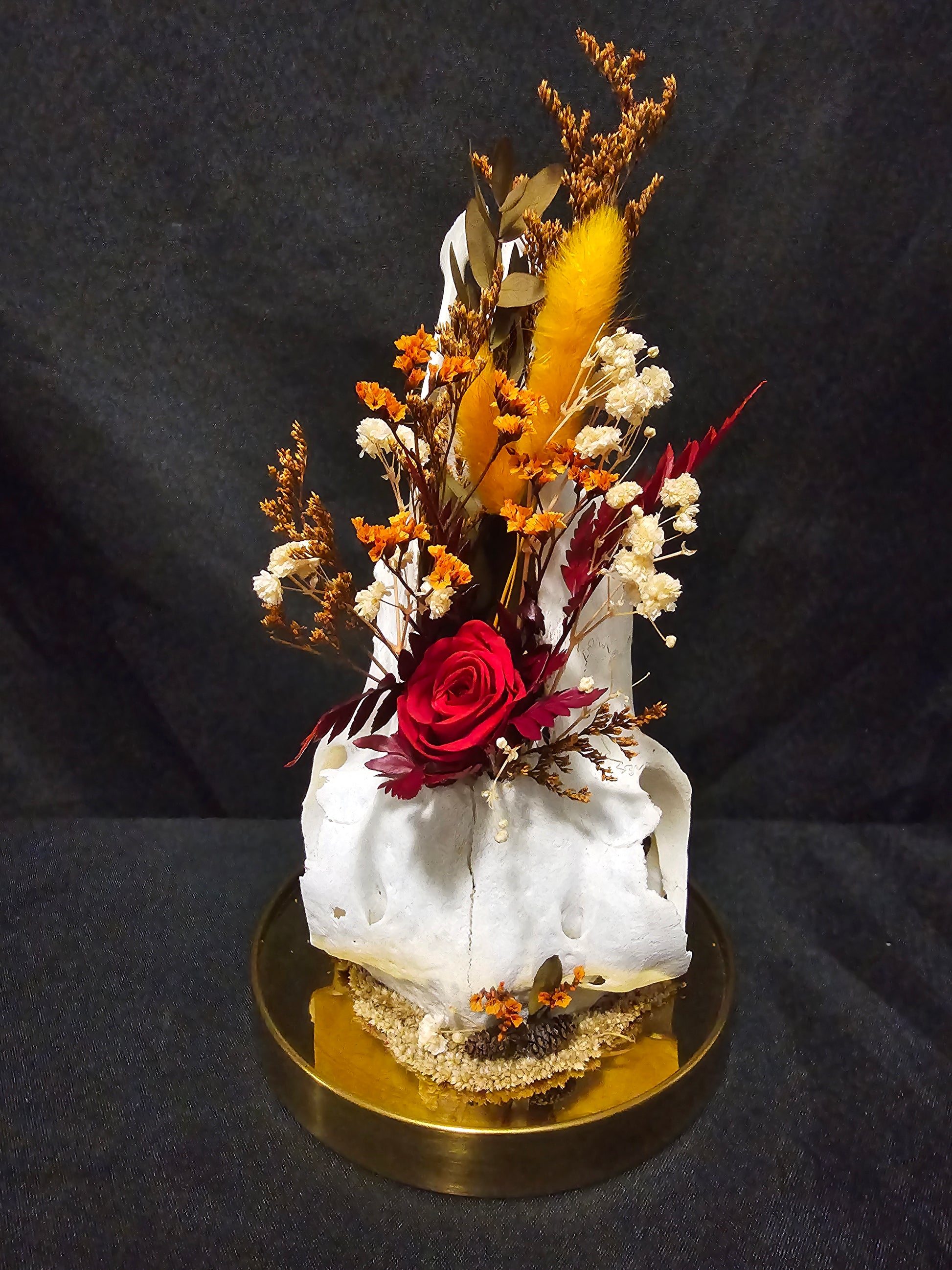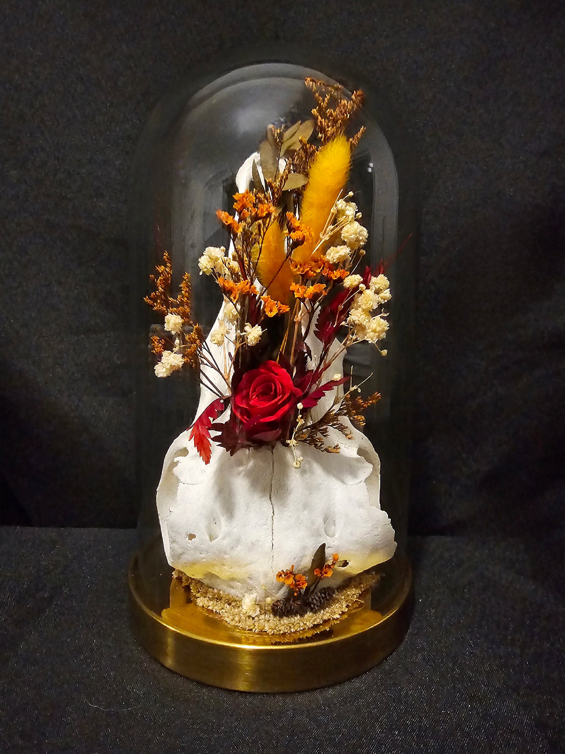 A glass dome terrarium housing a real sheep skull, a preserved red rose and flowers.