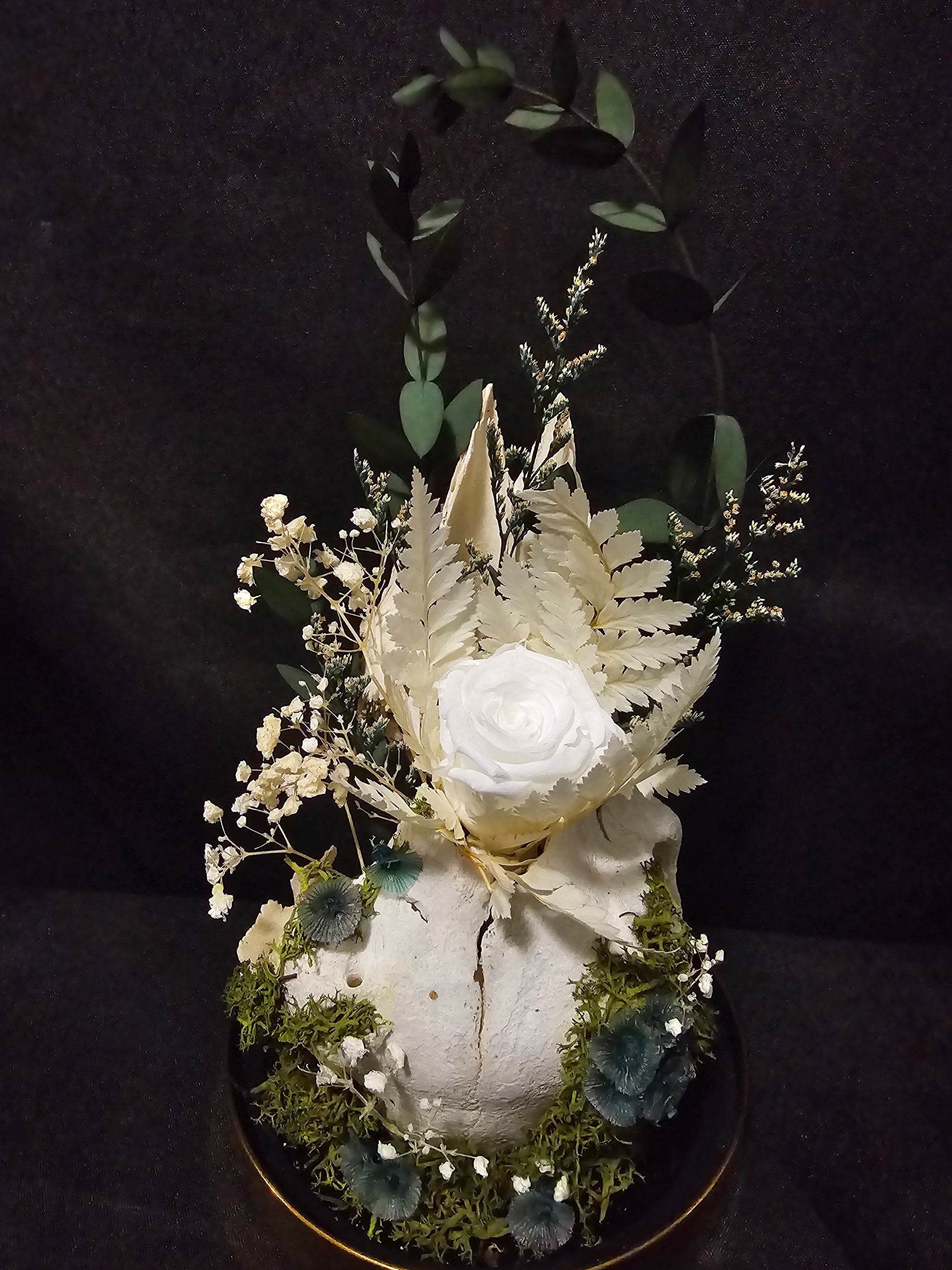 A glass dome terrarium housing a real sheep skull and preserved flowers.